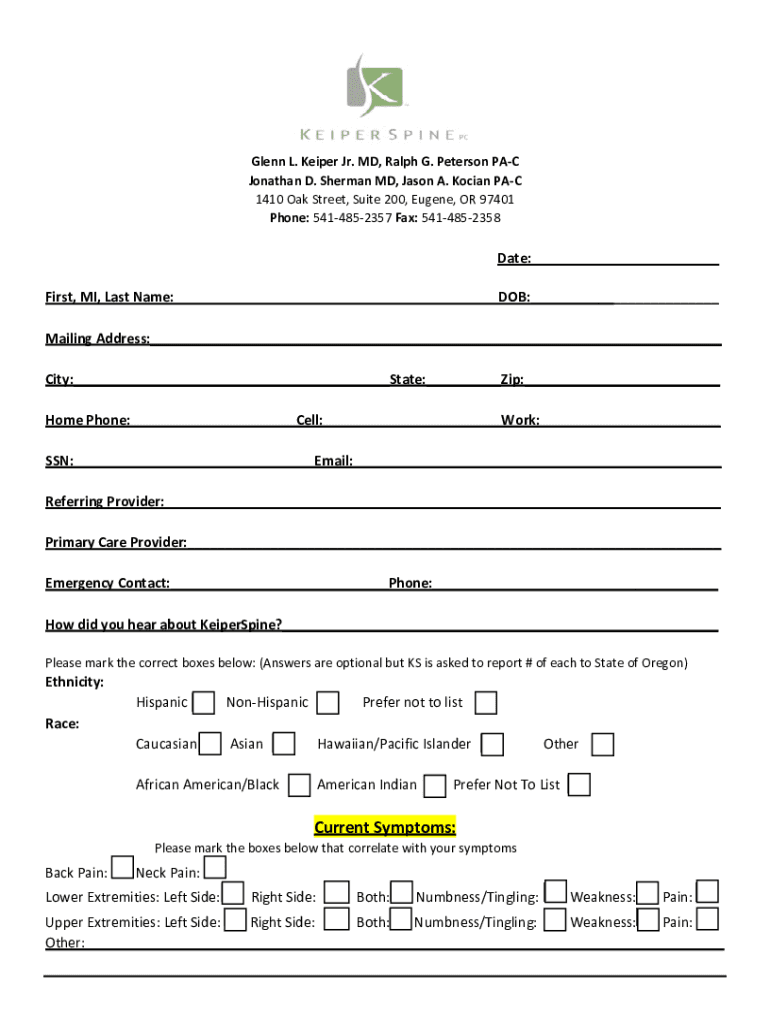 Glenn L. Keiper Jr. MD, Ralph G. Peterson PAC Jonathan D. Sherman MD, Jason A. Kocian PAC 1410 Oak Street, Suite 200, Eugene, OR 97401 Phone: 5414852357 Fax: 5414852358Date:___ First, MI, Last Name:DOB:___Mailing