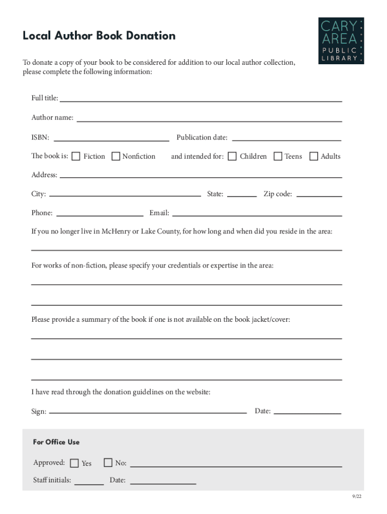 Local Author Book Donation To donate a copy of your book to be considered for addition to our local author collection, please complete the following information: Full title: Author name: ISBN: The