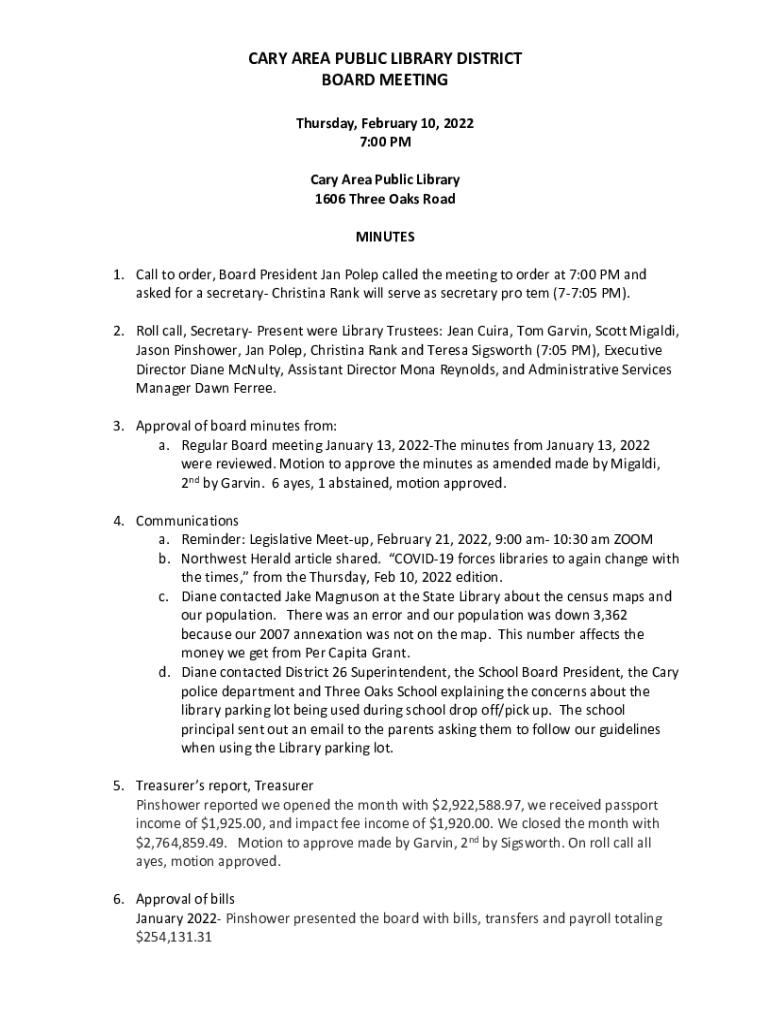 CARY AREA PUBLIC LIBRARY DISTRICT BOARD MEETING Thursday, February 10, 2022 7:00 PM Cary Area Public Library 1606 Three Oaks Road MINUTES 1. Call to order, Board President Jan Polep called the meeting