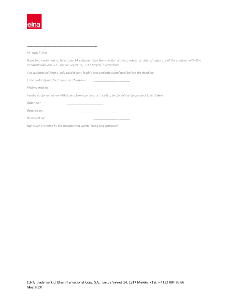 ___ RETURN FORM Form to be returned no later than 14 calendar days from receipt of the products or date of signature of the contract with Elna International Corp. S.A., rue de Veyrot 14, 1217 Meyrin,