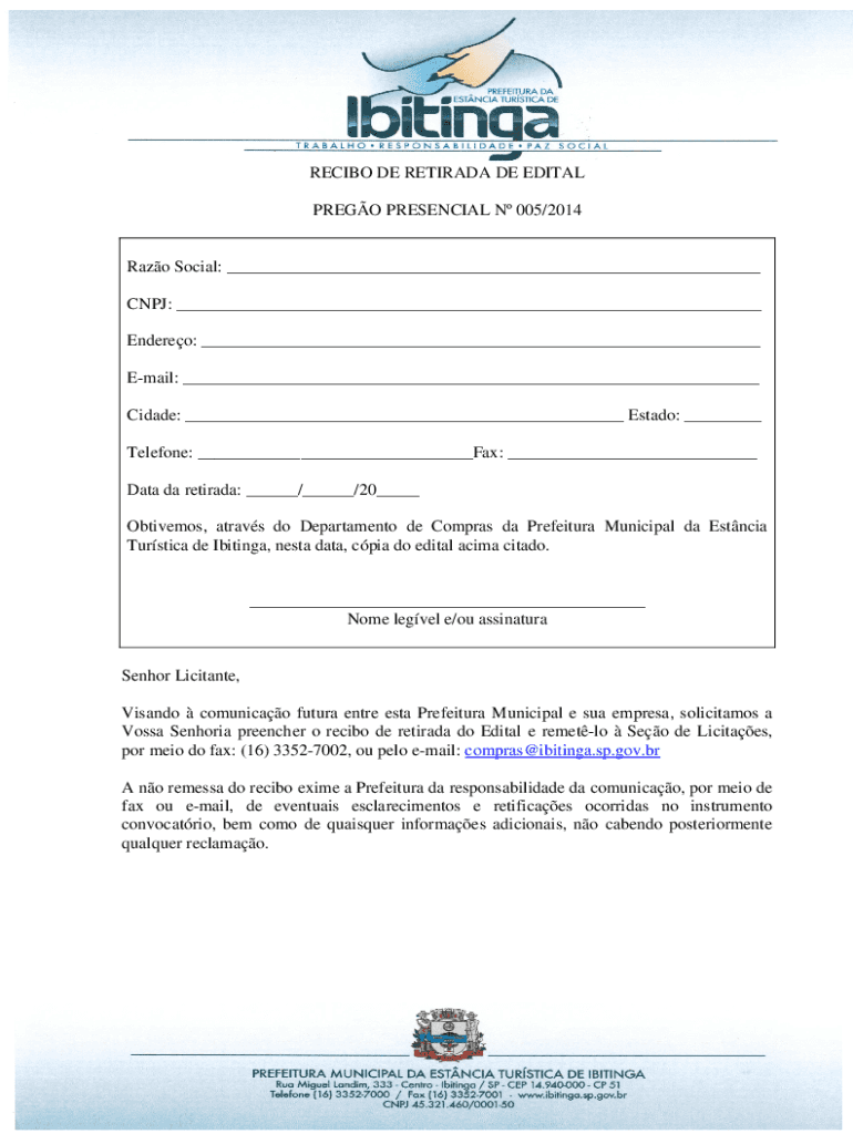 RECIBO DE RETIRADA DE EDITAL PREGO PRESENCIAL N 005/2014 Razo Social: ___ CNPJ: ___ Endereo: ___ Email: ___ Cidade: ___ Estado: ___ Telefone: ___Fax: ___ Data da retirada: ___/___/20___ Obtivemos,