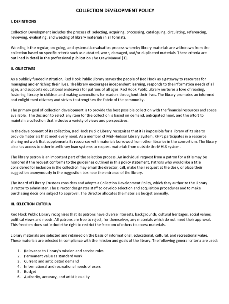 COLLECTION DEVELOPMENT POLICY I. DEFINITIONS Collection Development includes the process of: selecting, acquiring, processing, cataloguing, circulating, referencing, reviewing, evaluating, and weeding