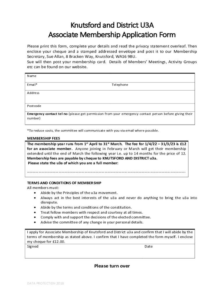 Knutsford and District U3A Associate Membership Application Form Please print this form, complete your details and read the privacy statement overleaf. Then enclose your cheque and a stamped addressed