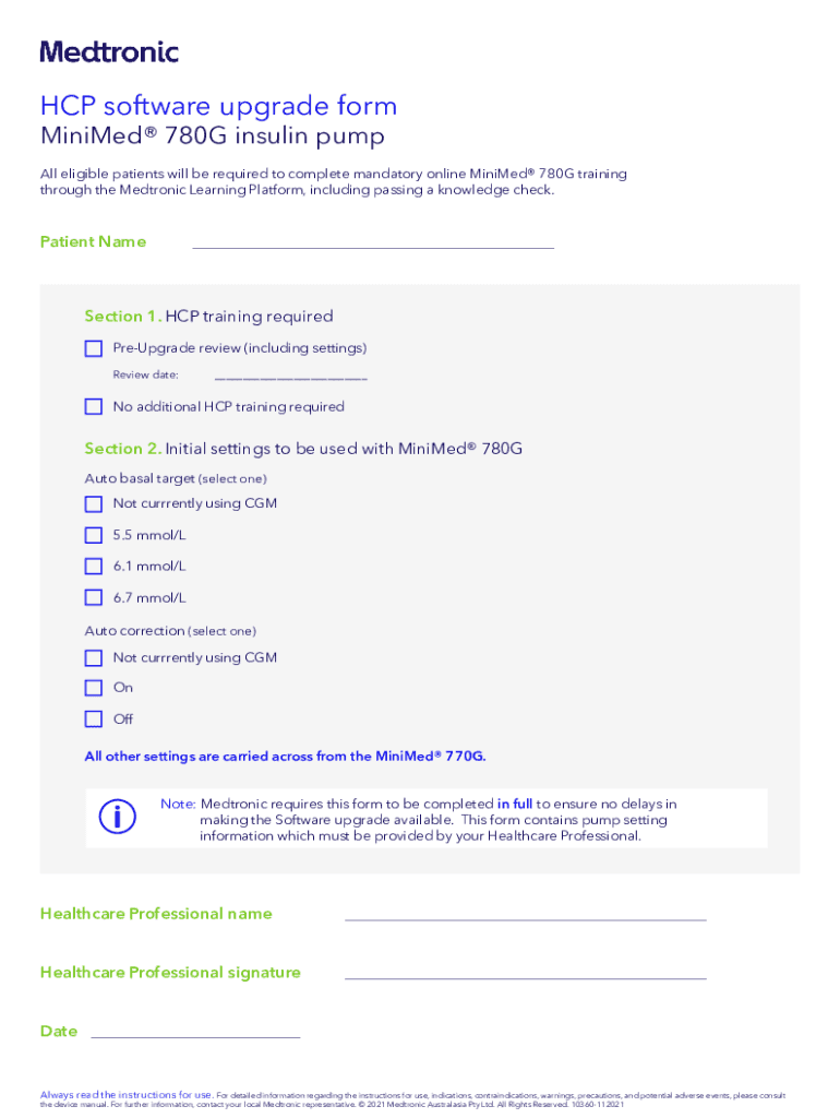 HCP software upgrade form MiniMed 780G pumpAll eligible patients will be required to complete mandatory online MiniMed 780G training through the Medtronic Learning Platform, including passing a knowledge