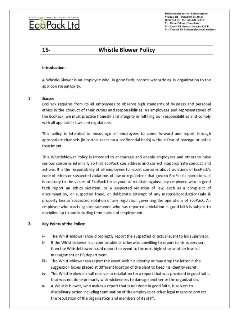 Policies under review & development VersionIII Dated (05042016) Reviewed by: Mr. Ali Adil (CFO) Mr. Raza.Chinoy (Consultant) Mr. Zamir Ul Hassan (Director C&T) Mr. Tauseef Ur Rehman (Internal Auditor)15Whistle