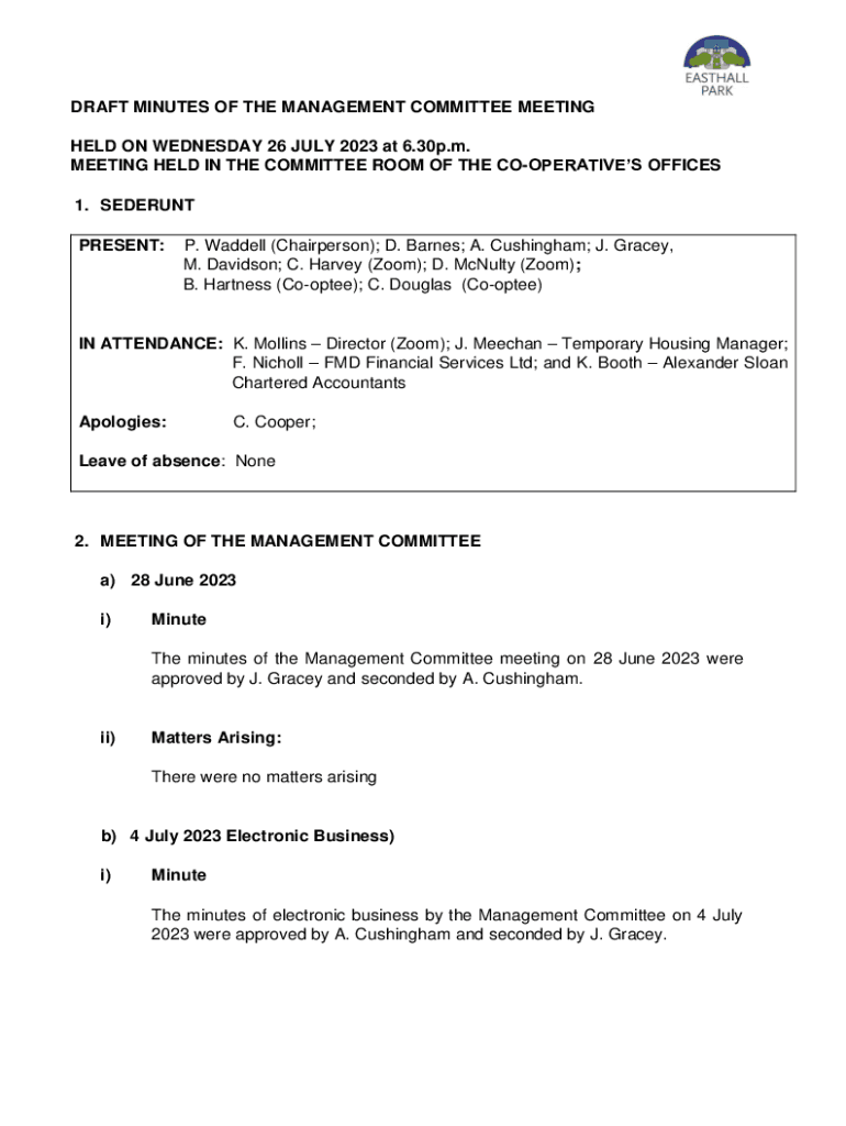 DRAFT MINUTES OF THE MANAGEMENT COMMITTEE MEETING HELD ON WEDNESDAY 26 JULY 2023 at 6.30p.m. MEETING HELD IN THE COMMITTEE ROOM OF THE COOPERATIVES OFFICES 1. SEDERUNT PRESENT:P. Waddell (Chairperson);
