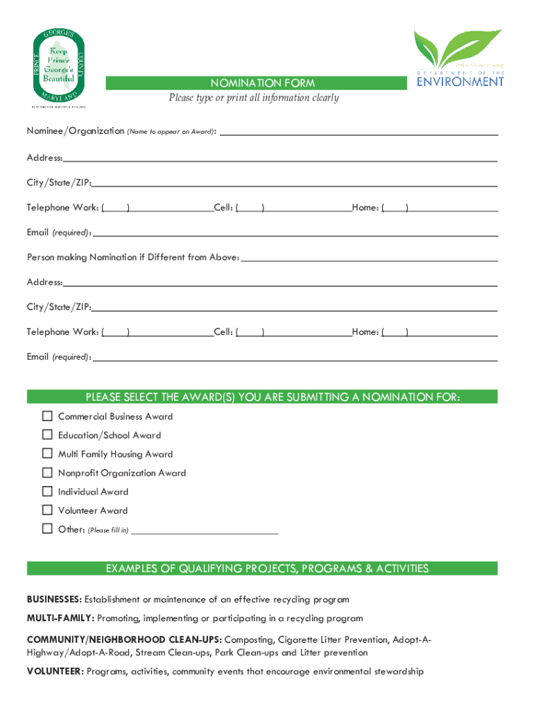 WASTE DIVERSION and Recycling Awards 2021 NOMINATION FORM and GUIDELINES In honor of America Recycles Day/National Recycling Day on November 15, Keep Prince Georges County Beautiful (KPGCB) and the