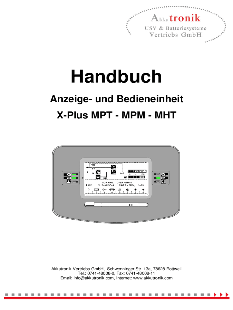 Handbuch Anzeige und Bedieneinheit XPlus MPT MPM MHTAkkutronik Vertriebs GmbH, Schwenninger Str. 13a, 78628 Rottweil Tel.: 0741480080, Fax: 07414800811 Email: info@akkutronik.com, Internet: www.akkutronik.com