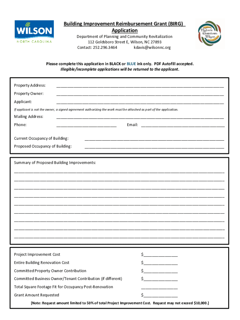 Building Improvement Reimbursement Grant (BIRG) Instructions Department of Planning and Community Revitalization 112 Goldsboro Street E, Wilson, NC 27893 Purpose: The purpose of the Building Improvement