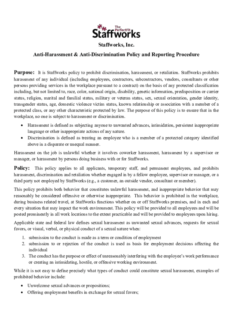 Staffworks, Inc. AntiHarassment & AntiDiscrimination Policy and Reporting Procedure Purpose: It is Staffworks policy to prohibit discrimination, harassment, or retaliation. Staffworks prohibits harassment
