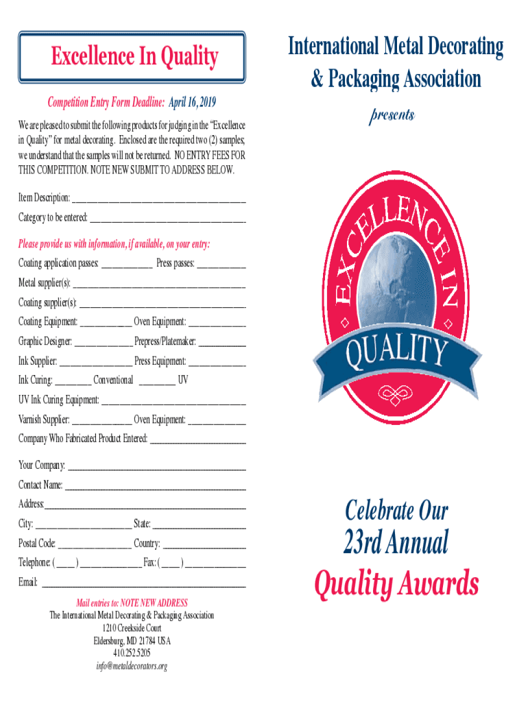 Excellence In Quality Competition Entry Form Deadline: April 16, 2019 We are pleased to submit the following products for judging in the Excellence in Quality for metal decorating. Enclosed are the