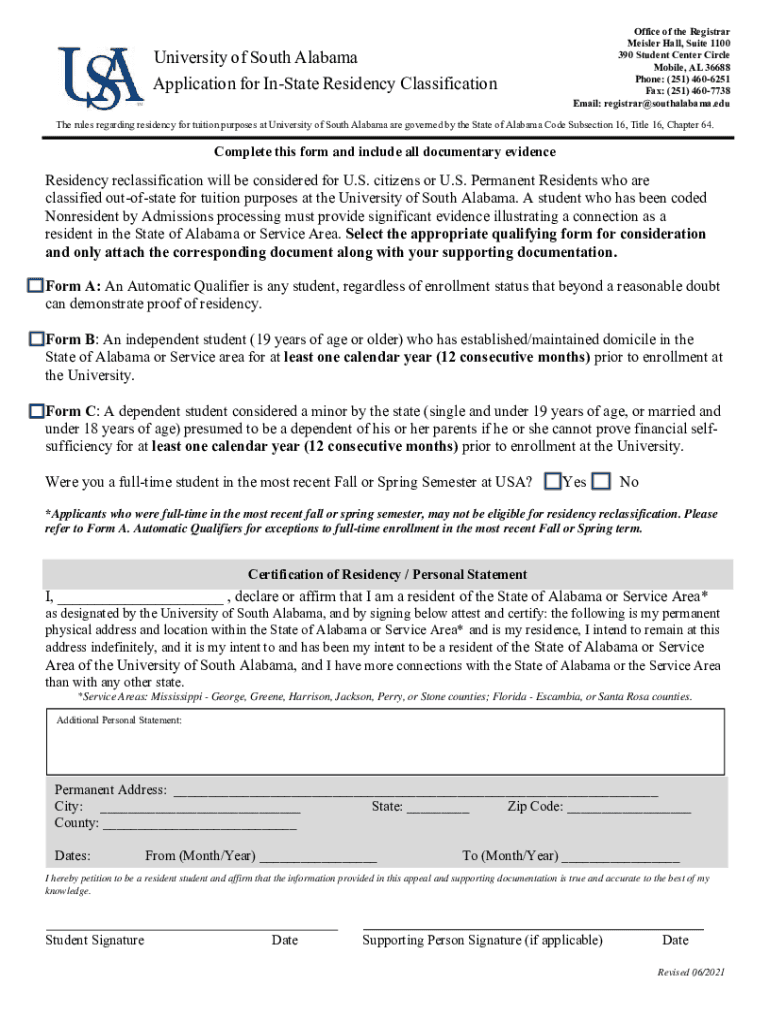 University of South Alabama Application for InState Residency ClassificationOffice of the Registrar Meisler Hall, Suite 1100 390 Student Center Circle Mobile, AL 36688 Phone: (251) 4606251 Fax: (251)
