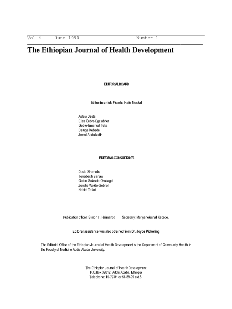 Vol 4June 1990Number 1___The Ethiopian Journal of Health DevelopmentEDITORIALBOARDEditorinchief: Fisseha Haile Meskal Asfaw Desta Elias GebreEgziabher GebreEmanuel Teka Derege Kebede Jemal AbdulkadirEDITORIALCONSULTANTS