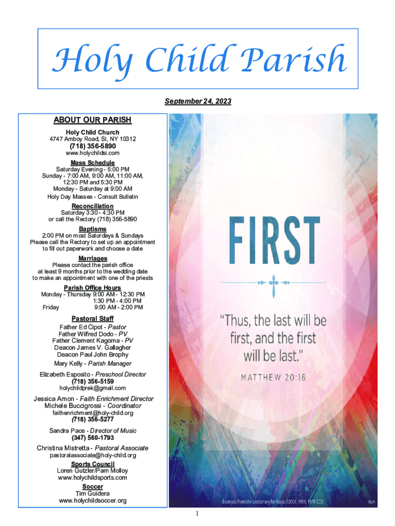 Holy Child Parish September 24, 2023ABOUT OUR PARISH Holy Child Church 4747 Amboy Road, SI, NY 10312(718) 3565890 www.holychildsi.comMass Schedule Saturday Evening 5:00 PM Sunday 7:00 AM, 9:00 AM,
