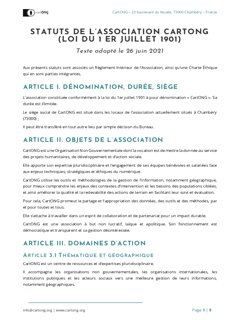CartONG 23 boulevard du Muse, 73000 Chambry FranceSTATUTS DE LASSOCIATION CARTONG (LOI DU 1 ER JUILLET 1901) Texte adopt le 26 juin 2021 Aux prsents statuts sont associs un Rglement Intrieur de lAssociation,