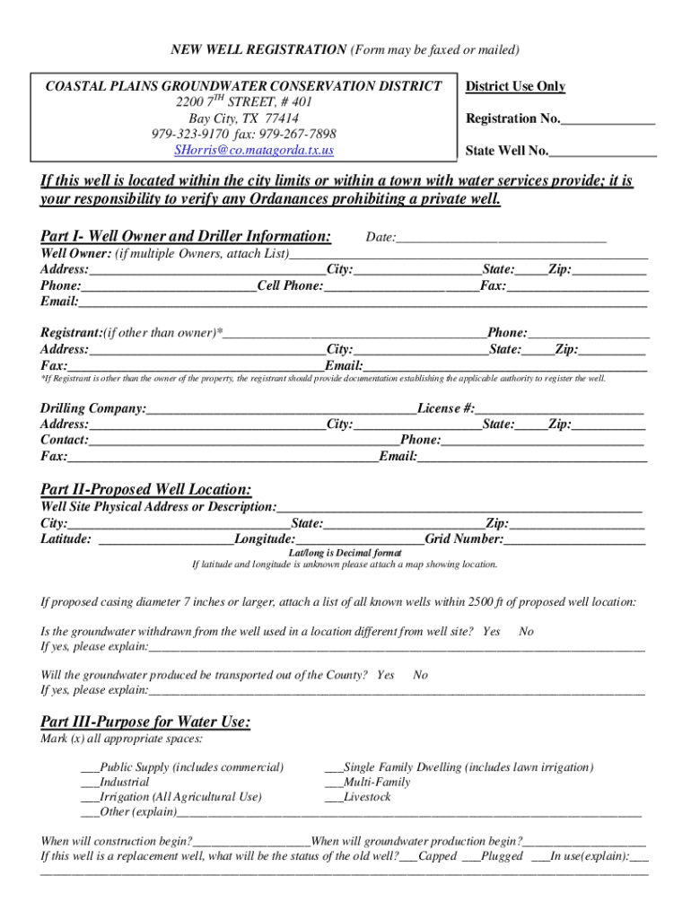 NEW WELL REGISTRATION (Form may be faxed or mailed) COASTAL PLAINS GROUNDWATER CONSERVATION DISTRICT 2200 7TH STREET, # 401 Bay City, TX 77414 9793239170 fax: 9792677898 SHorris@co.matagorda.tx.usDistrict