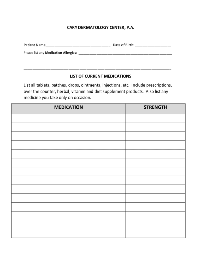 CARY DERMATOLOGY CENTER, P.A. Patient Name___ Date of Birth: ___ Please list any Medication Allergies: ___ ___ ___LIST OF CURRENT MEDICATIONS List all tablets, patches, drops, ointments, injections,