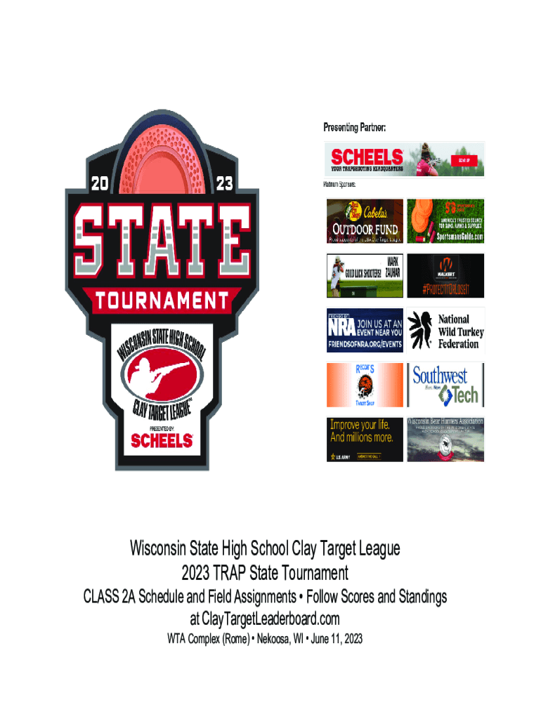 Wisconsin State High School Clay Target League 2023 TRAP State TournamentCLASS 2A Schedule and Field Assignments Follow Scores and Standings at ClayTargetLeaderboard.com WTA Complex (Rome) Nekoosa,