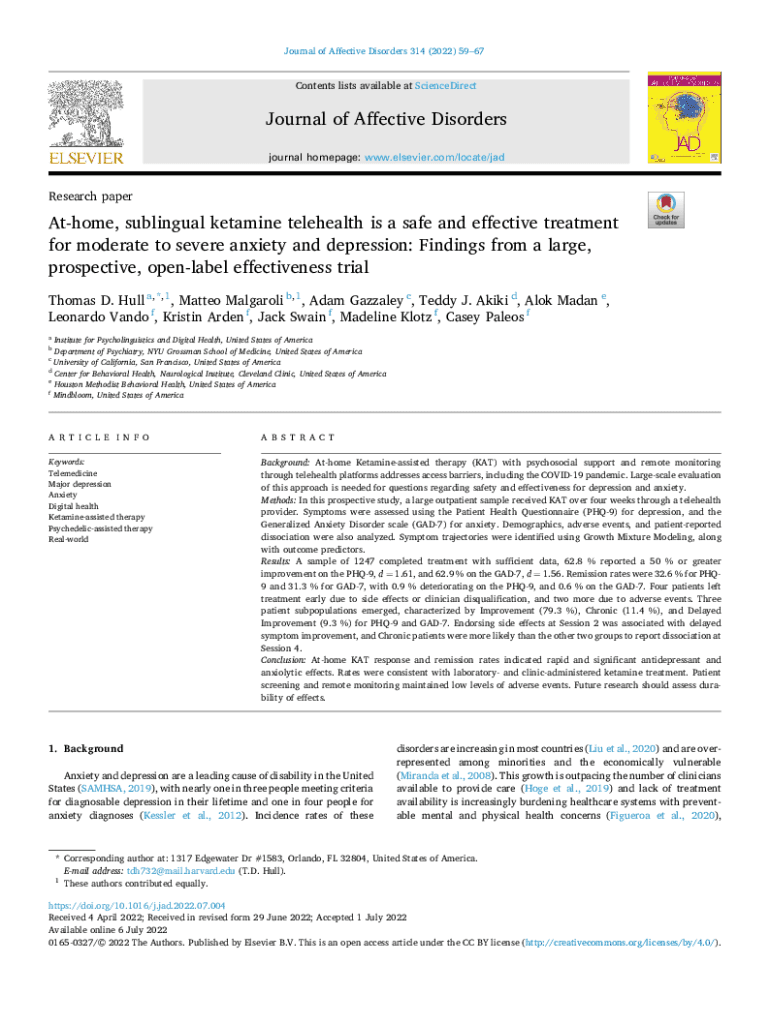 Journal of Affective Disorders 314 (2022) 5967Contents lists available at ScienceDirectJournal of Affective Disorders journal homepage: www.elsevier.com/locate/jadResearch paperAthome, sublingual