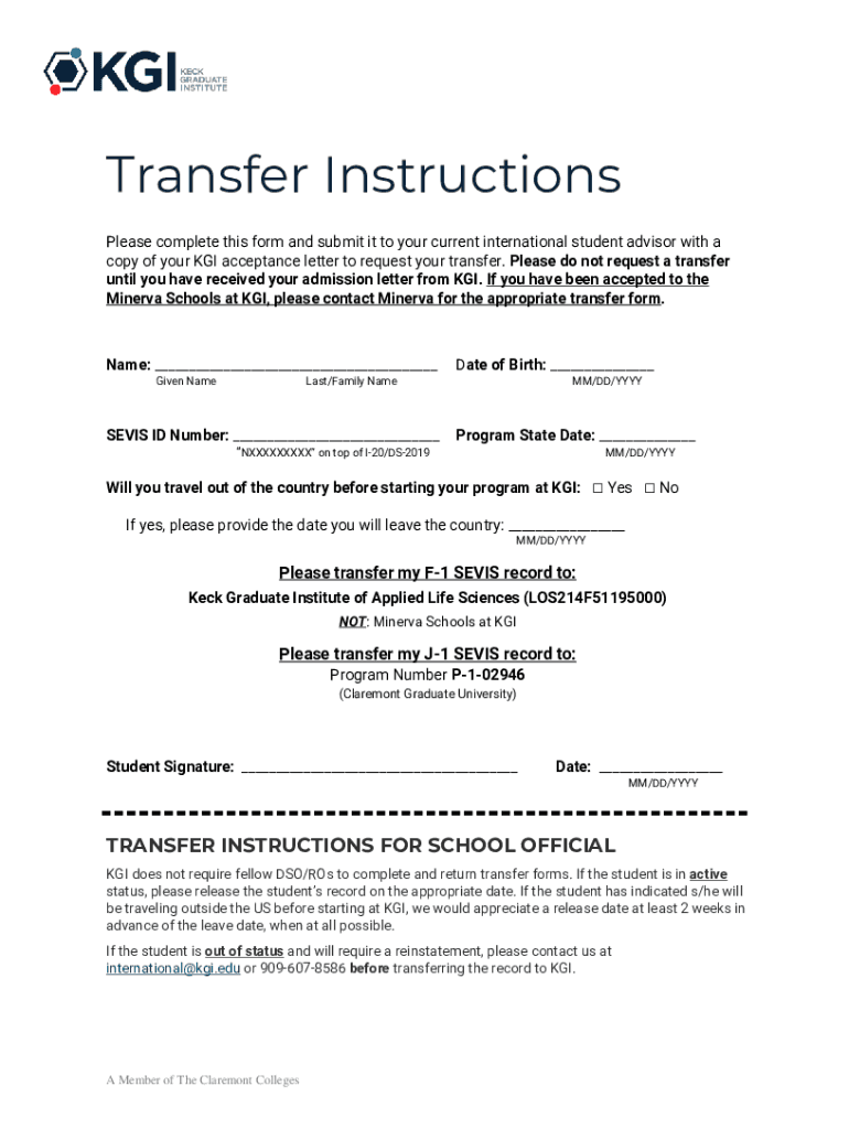 Transfer Instructions Please complete this form and submit it to your current international student advisor with a copy of your KGI acceptance letter to request your transfer. Please do not request