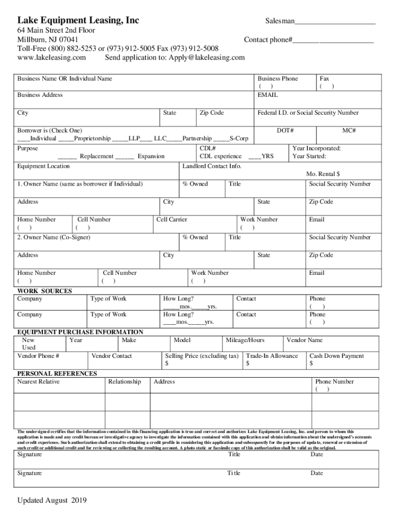 Lake Equipment Leasing, IncSalesman___64 Main Street 2nd Floor Millburn, NJ 07041 Contact phone#___ TollFree (800) 8825253 or (973) 9125005 Fax (973) 9125008 www.lakeleasing.com Send application to: