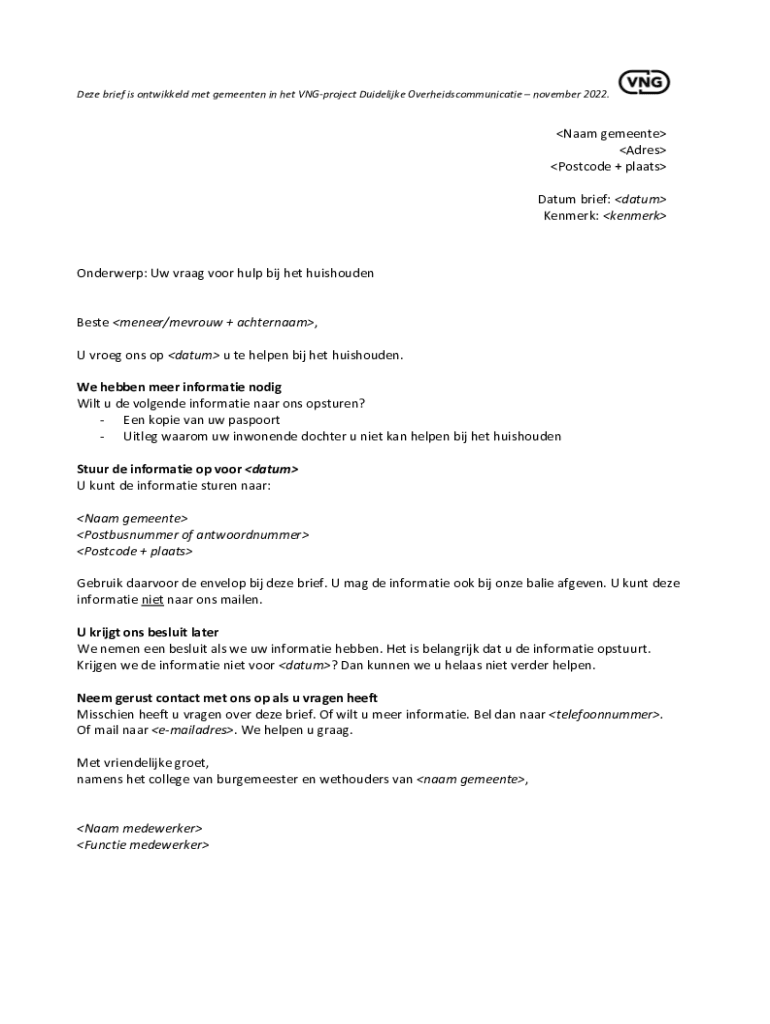 Deze brief is ontwikkeld met gemeenten in het VNGproject Duidelijke Overheidscommunicatie november 2022.Naam gemeente Adres Postcode + plaats Datum brief: datum Kenmerk: kenmerkOnderwerp: Uw vraag