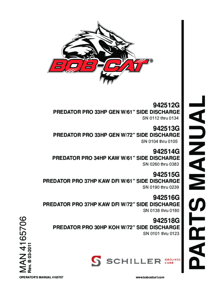 PREDATOR PRO 33HP GEN W/61 SIDE DISCHARGE SN 0112 thru 0134942513G PREDATOR PRO 33HP GEN W/72 SIDE DISCHARGE SN 0104 thru 0105942514G PREDATOR PRO 34HP KAW W/61 SIDE DISCHARGE SN 0260 thru 0383942515G