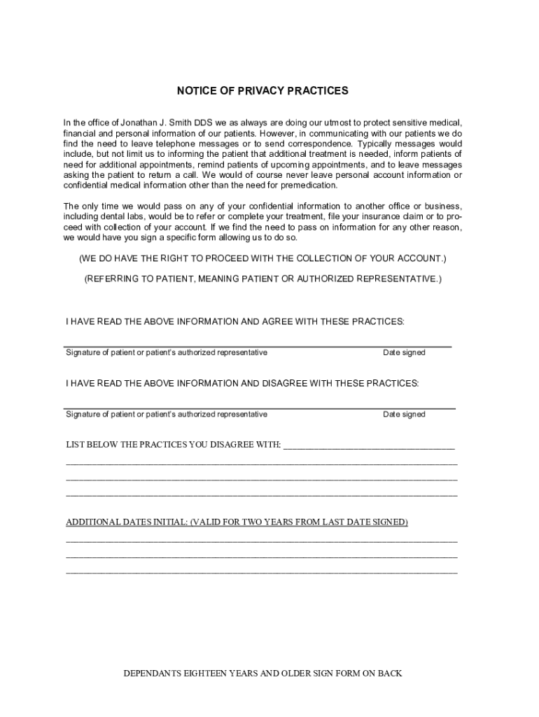 NOTICE OF PRIVACY PRACTICES In the office of Jonathan J. Smith DDS we as always are doing our utmost to protect sensitive medical, financial and personal information of our patients. However, in communicating