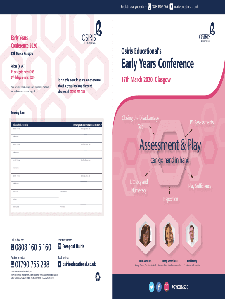 Book to save place: 0808 5 160and P1 osiriseducational.co.uk Suitable for: your 4 Teachers and Leaders of 160 PreSchoolEarly Years Conference 2020Osiris Educationals17th March, Glasgow Prices (+ VAT)