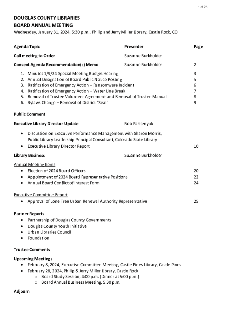 1 of 25DOUGLAS COUNTY LIBRARIES BOARD ANNUAL MEETING Wednesday, January 31, 2024, 5:30 p.m., Philip and Jerry Miller Library, Castle Rock, CO Agenda TopicPresenterCall meeting to OrderSuzanne BurkholderConsent
