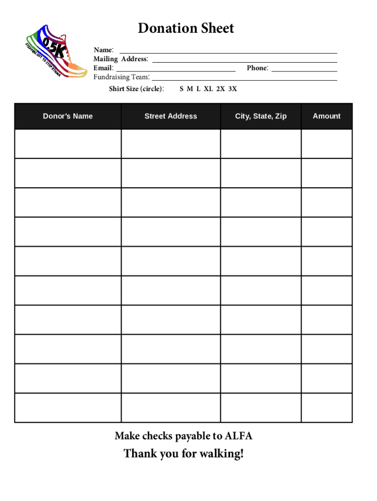 Donor\'s NameS M L XL 2X 3XStreet AddressCity, State, ZipMake checks payable to ALFAThank you for