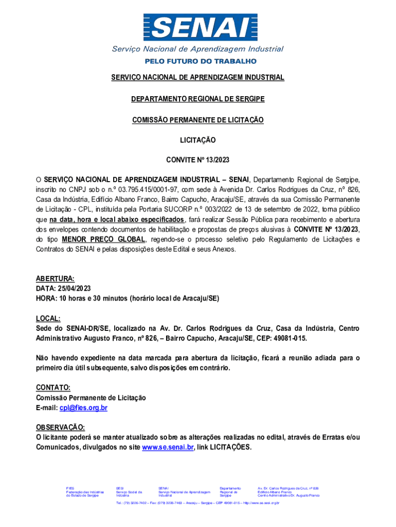 SERVIO NACIONAL DE APRENDIZAGEM INDUSTRIAL DEPARTAMENTO REGIONAL DE SERGIPE COMISSO PERMANENTE DE LICITAO LICITAO CONVITE N 13/2023 O SERVIO NACIONAL DE APRENDIZAGEM INDUSTRIAL SENAI, Departamento