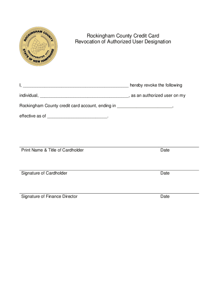 Rockingham County Credit Card Revocation of Authorized User DesignationI, ___ hereby revoke the following individual, ___, as an authorized user on my Rockingham County credit card account, ending