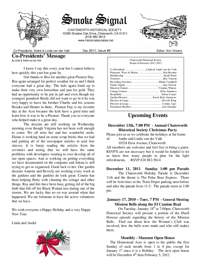 Smoke Signal CHATSWORTH HISTORICAL SOCIETY 10385 Shadow Oak Drive, Chatsworth, CA 91311 (818) 8825614 www.historicalsocieties.net CoPresidents: Andr & Linda van der ValkDec 2011, Issue #5Editor: Ann
