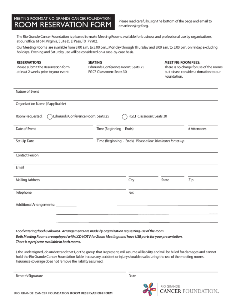 MEETING ROOMS AT RIO GRANDE CANCER FOUNDATIONROOM RESERVATION Formulas read carefully, sign the bottom of the page and email to