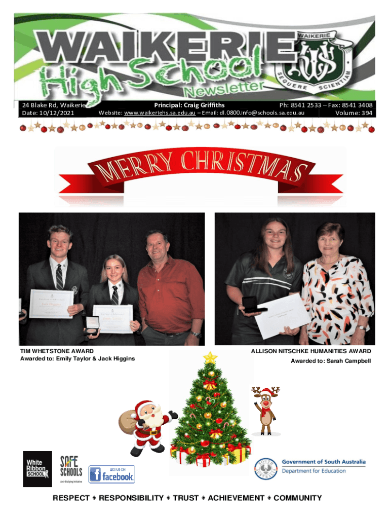 24 Blake Rd, Waikerie Date: 10/12/2021Principal: Craig GriffithsPh: 8541 2533 Fax: 8541 3408 Volume: 394Website: www.waikeriehs.sa.edu.au Email: dl.0800.info@schools.sa.edu.auTIM WHETSTONE AWARD Awarded