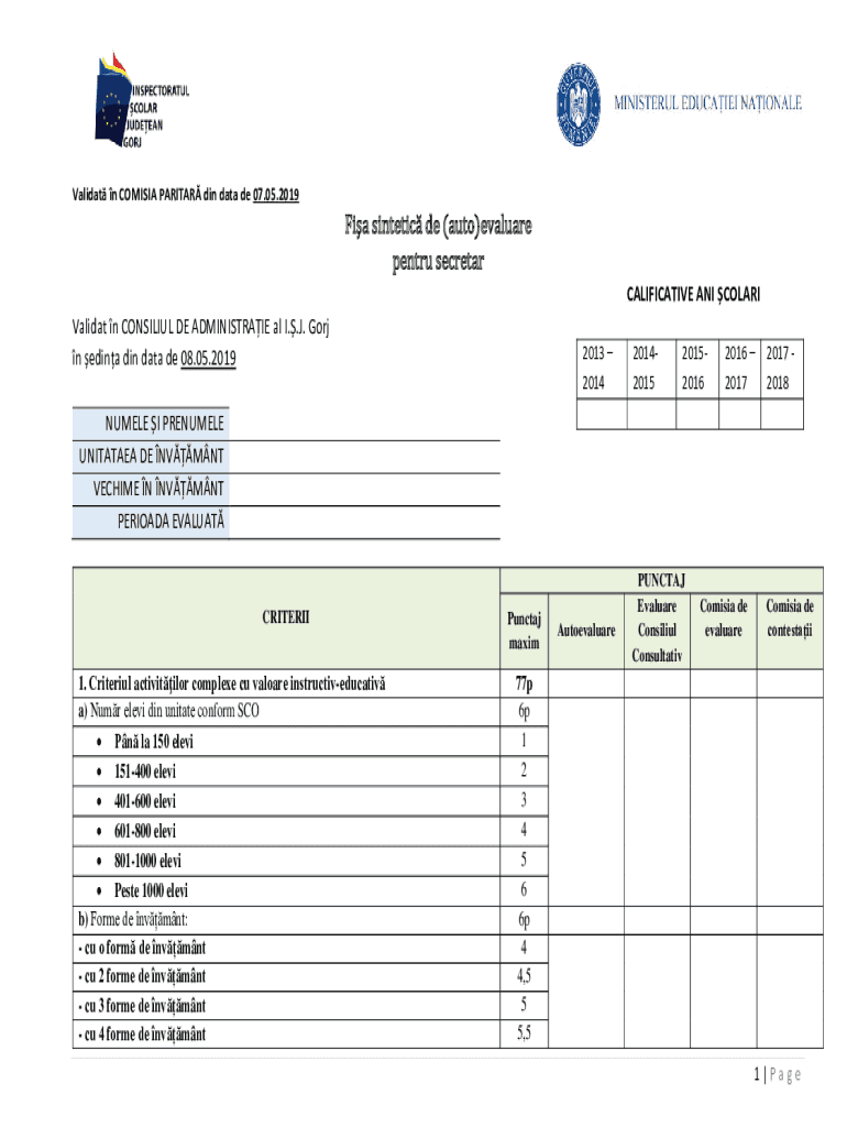 Validat n COMISIA PARITAR din data de 07.05.2019Validat n CONSILIUL DE ADMINISTRAIE al I..J. Gorj n edina din data de 08.05.2019Fia sintetic de (auto)evaluare pentru secretarCALIFICATIVE ANI COLARI