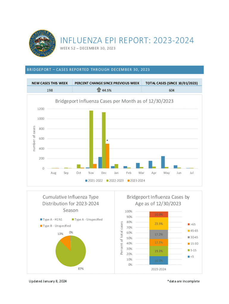 INFLUENZA EPI REPORT: 20232024 WEEK 52 DECEMBER 30, 2023BRIDGEPORT CASES REPORTED THROUGH DECEMBER 30, 2023 NEW CASES THIS WEEKPERCENT CHANGE SINCE PREVIOUS WEEKTOTAL CASES (SINCE 10/01/2023)19844.5%604Bridgeport