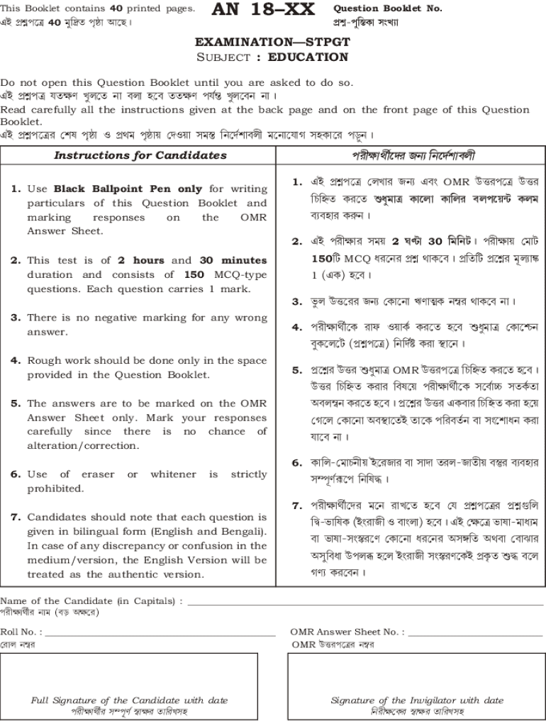 This Booklet contains 40 printed pages.& y 40 [t \"AN 18XXQuestion Booklet No.[zA JEXAMINATIONSTPGT SUBJECT : EDUCATION Do not open this Question Booklet until you are asked to do so.& y to Jt tto