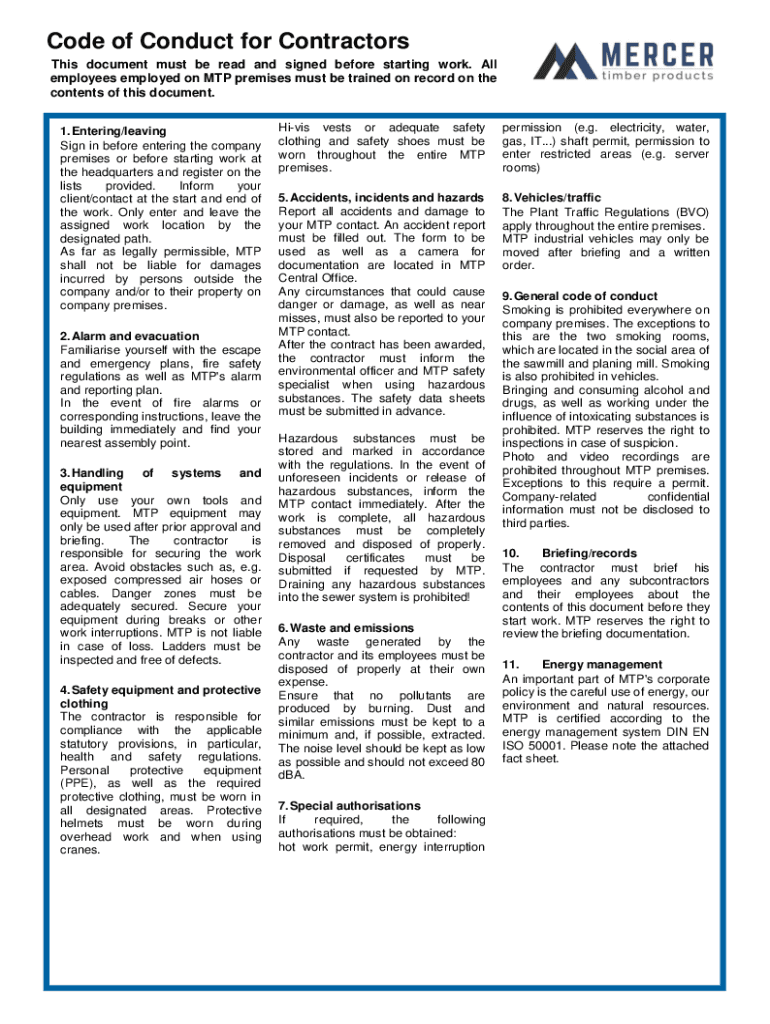 Code of Conduct for Contractors This document must be read and signed before starting work. All employees employed on MTP premises must be trained on record on the contents of this document. 1. Entering/leaving