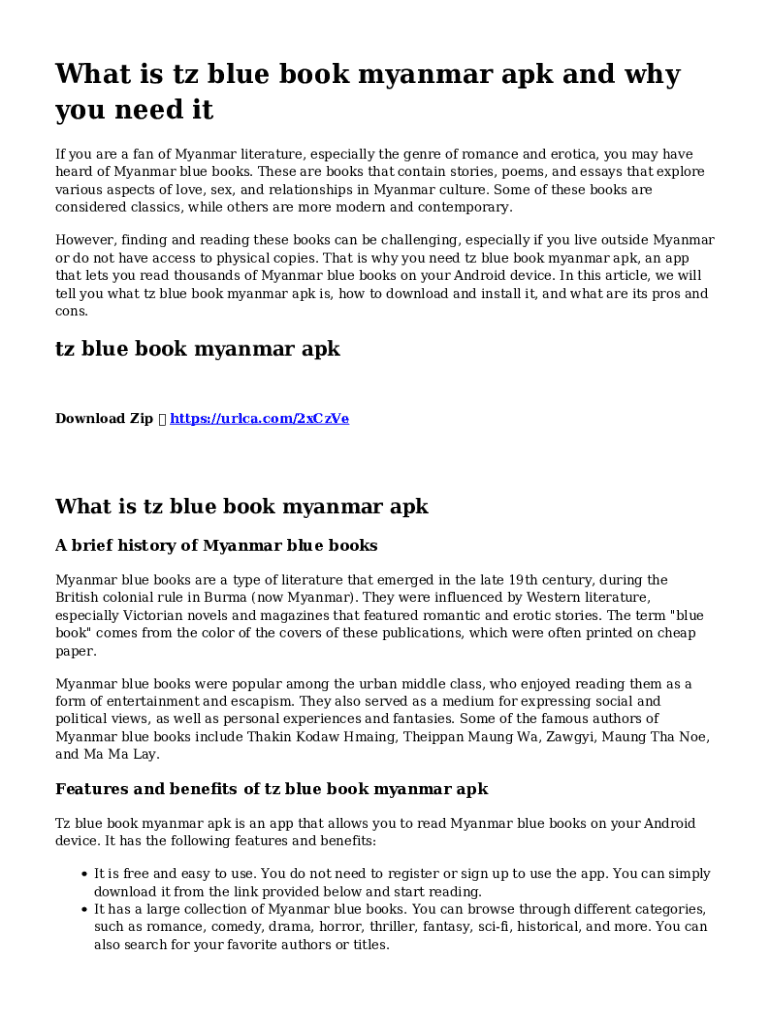 What is tz blue book myanmar apk and why you need it If you are a fan of Myanmar literature, especially the genre of romance and erotica, you may have heard of Myanmar blue books. These are books