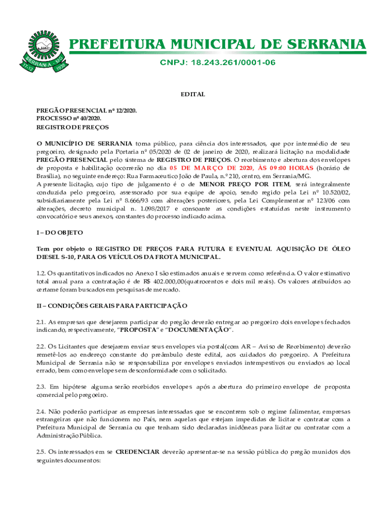 EDITAL PREGO PRESENCIAL n 12/2020. PROCESSO n 40/2020. REGISTRO DE PREOS O MUNICPIO DE SERRANIA torna pblico, para cincia dos interessados, que por intermdio de seu pregoeiro, designado pela Portaria
