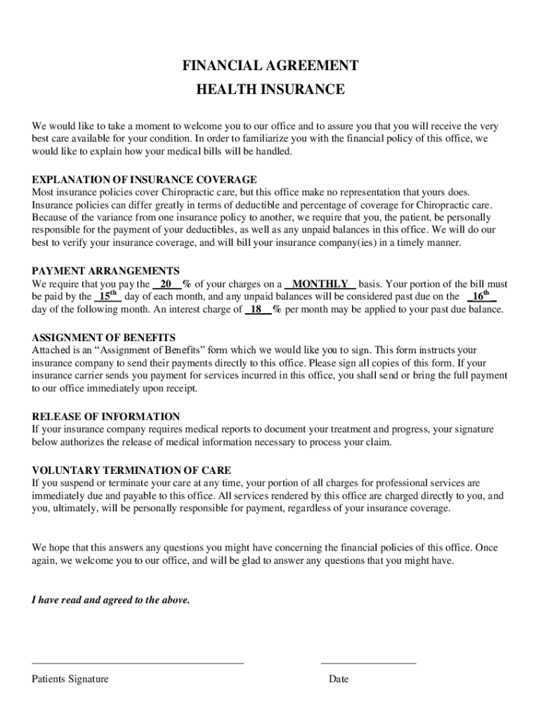 Financial agreement health insurance refers to a contractual arrangement between individuals and insurance providers that outlines the terms of health coverage, including benefits, premiums, and deductibles.