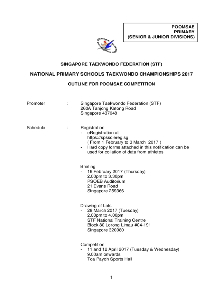 POOMSAE PRIMARY (SENIOR & JUNIOR DIVISIONS)SINGAPORE TAEKWONDO FEDERATION (STF)NATIONAL PRIMARY SCHOOLS TAEKWONDO CHAMPIONSHIPS 2017 OUTLINE FOR POOMSAE COMPETITIONPromoter:Singapore Taekwondo Federation