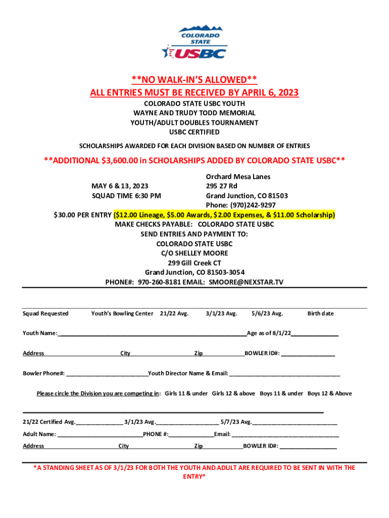 **NO WALKINS ALLOWED** ALL ENTRIES MUST BE RECEIVED BY APRIL 6, 2023 COLORADO STATE USBC YOUTH WAYNE AND TRUDY TODD MEMORIAL YOUTH/ADULT DOUBLES TOURNAMENT USBC CERTIFIED SCHOLARSHIPS AWARDED FOR