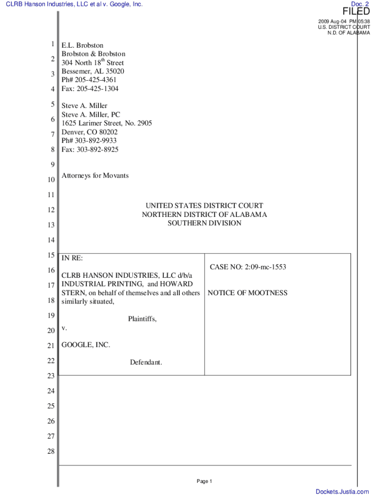 CLRB Hanson Industries, LLC et al v. Google, Inc.Doc. 2FILED 2009 Aug04 PM 05:38 U.S. DISTRICT COURT N.D. OF ALABAMA1 E.L. Brobston Brobston & Brobston 2 304 North 18th Street 3 Bessemer, AL 35020