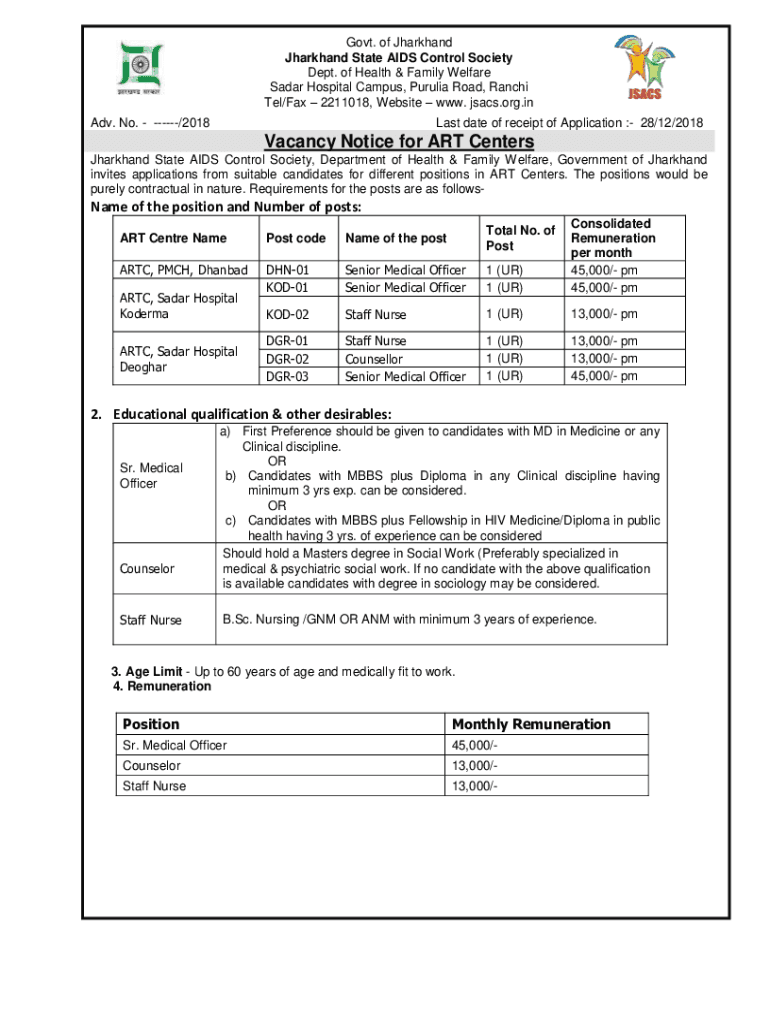 Govt. of Jharkhand State AIDS Control Society Dept. of Health & Family Welfare Radar Hospital Campus, Aurelia Road, Ranchi Tel/Fax 2211018, Website WWW. Jsacs.org.in Adv. No. /2018Last date of receipt