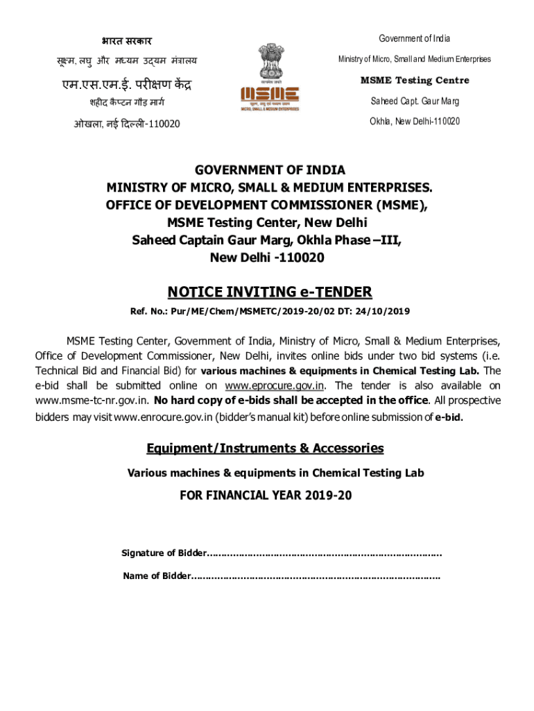 , Ministry of Micro, Small and Medium Enterprises.... MSME Testing Centre Saheed Capt. Gaur Marg, 110020Okhla, New Delhi110020GOVERNMENT OF INDIA
