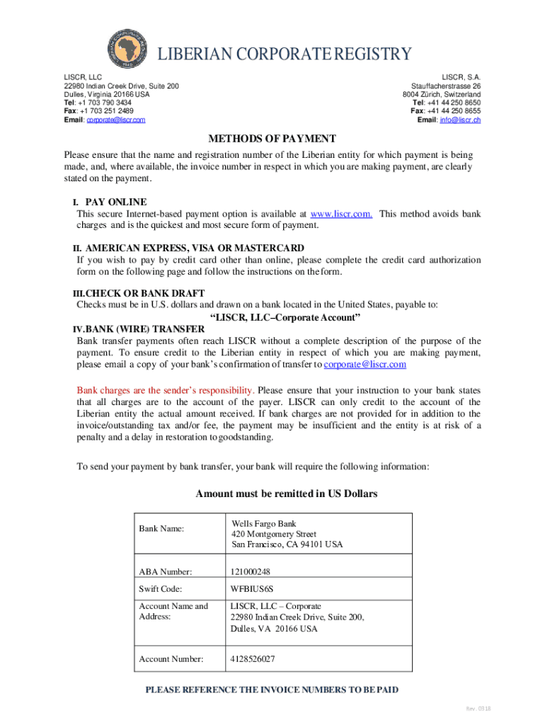 LIBERIAN CORPORATE REGISTRY LISCR, LLC 22980 Indian Creek Drive, Suite 200 Dulles, Virginia 20166 USA Tel: +1 703 790 3434 Fax: +1 703 251 2489 Email: corporate@liscr.comLISCR, S.A. Stauffacherstrasse
