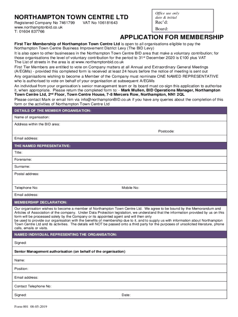 NORTHAMPTON TOWN CENTRE LTD Registered Company No 7461799 www.northamptonbid.co.uk T: 01604 837766VAT No 106181643Office use only date & initialRecd: Board:APPLICATION FOR MEMBERSHIP First Tier Membership